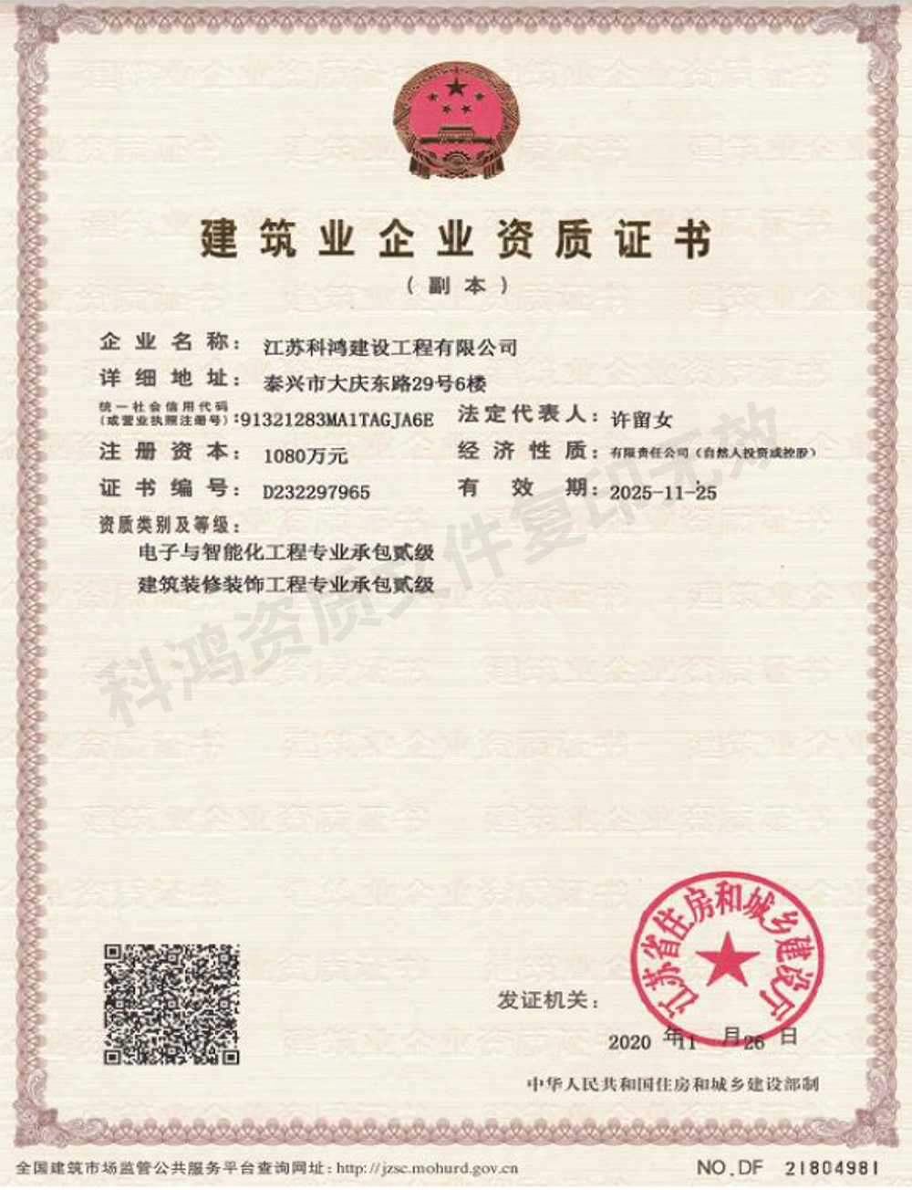 江蘇科鴻建設工程有限公司,前身是泰興科建網絡公司,始創于 2002 年,江蘇科建電子技術有限公司為旗下獨立子公司。是一家融 LED 視聽產品、智能化系統工程、網絡、監控、音響、視頻會務系統、消防、計算機服務、裝飾裝修、園林綠化、辦公設備銷售等為一體的綜合性工程公司。擅長于根據客戶需求,提供集成化方案制定、專業設計、定制式產品制造及施工。